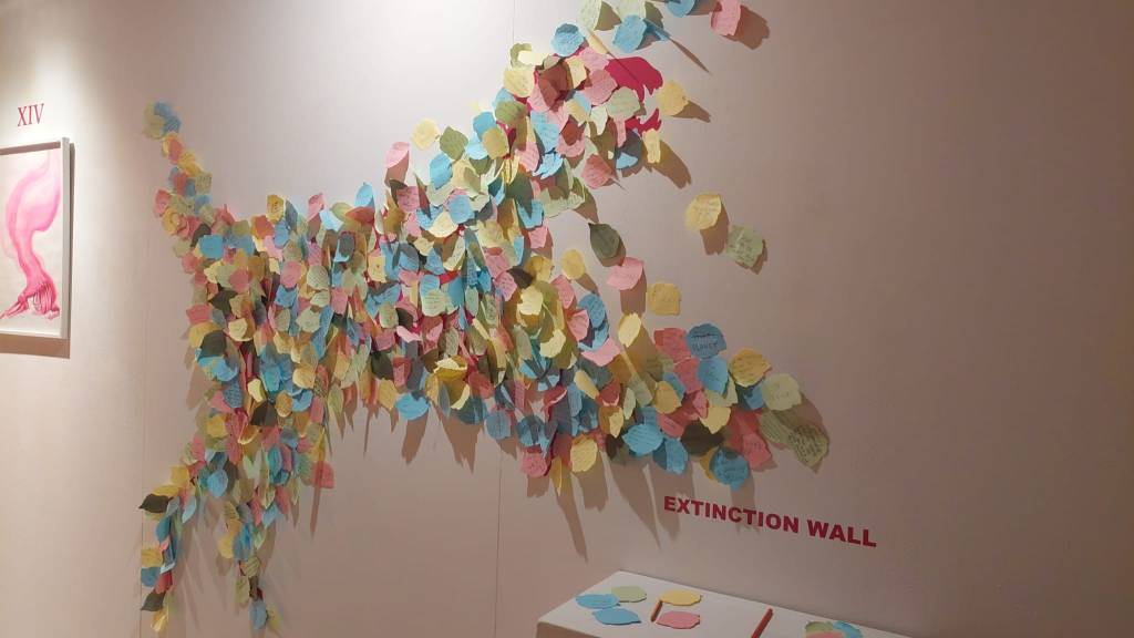 The collection of illustrations and paintings by the London-based illustrator, designer and visual artist Daniela ‘iella’ Attard represented climate anxiety and existential dread. The exhibition was divided into three parts: The first part was a passage of fourteen paintings of the Pharaoh Hound (Kelb tal-Fenek) that portrayed the processes of ecosystem collapse; the second part: a cluster of digitally illustrated figurative characters that showed the anxiety and deterioration of climate change; and lastly part 3 – the ‘extinction wall’ was a space for the public to write or draw any thoughts or hopes for the future on a sticky note and attach it to this wall with the aim to rebuild a 2D skeleton back to its natural form. An animated video of the exhibition was also on display for people to see.