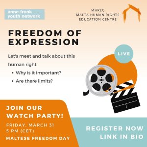 Here at MHREC we are excited to share that on Freedom Day, 31 March 2023 at 1700, we will meet online to talk about Freedom of Expression with the Anne Frank Youth Network and other network members.